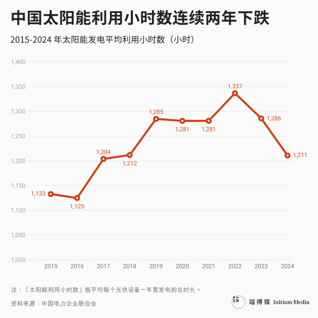 光伏发电装机容量持续增长的同时,中国的光伏利用小时数已连续两年下跌。2024年光伏利用小时数较前一年减少6%,降至2018年水平。