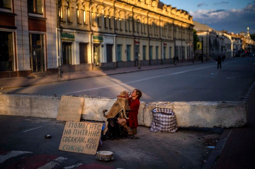2022年4月30日,一名妇女在基辅乞求施舍喂她的狗。摄:Emilio Morenatti/AP/达志影像
