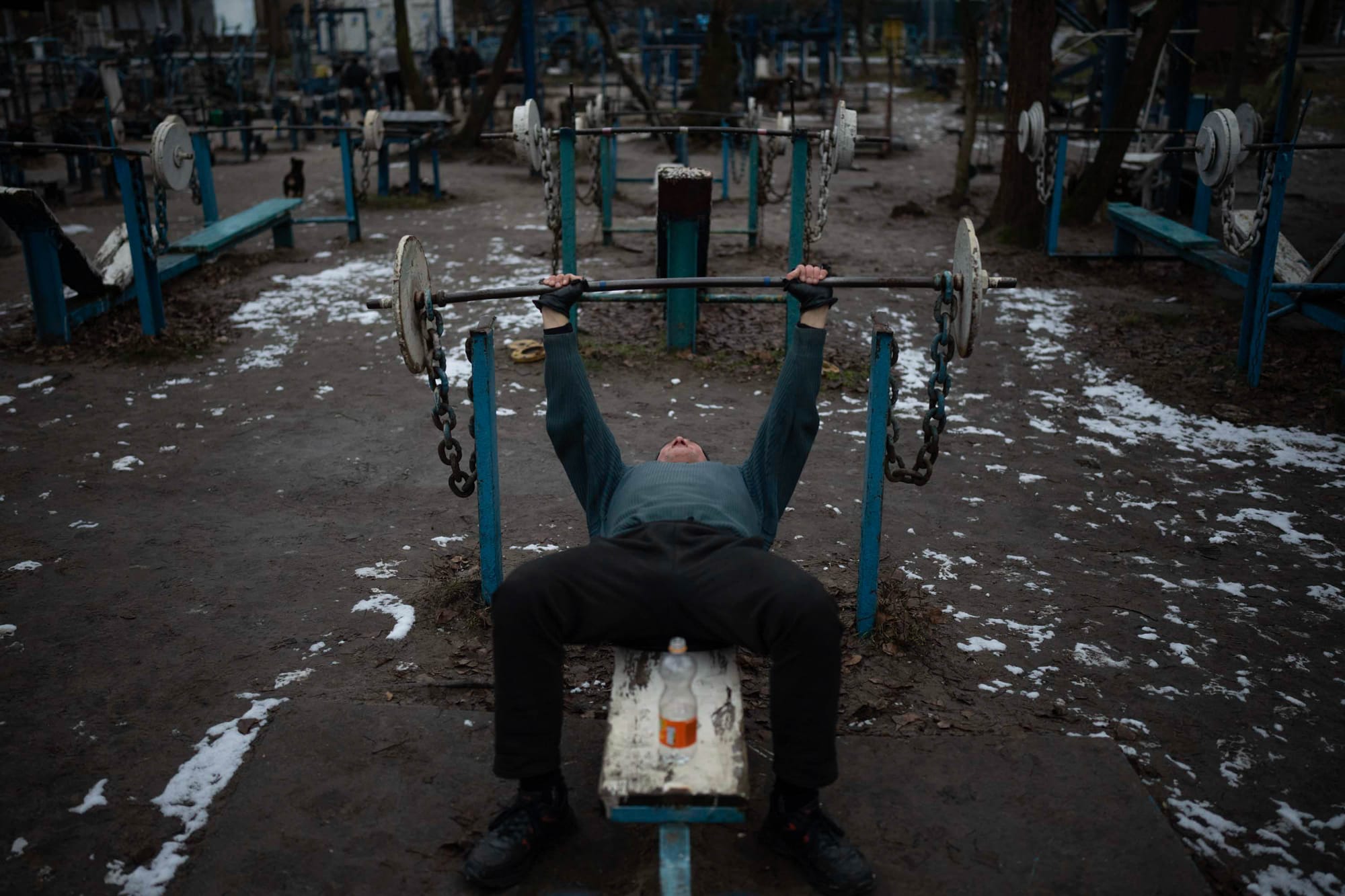 2023年2月3日,乌克兰基辅Kachalka户外健身馆,正在进行重量锻炼的一名男子。摄:Daniel Cole