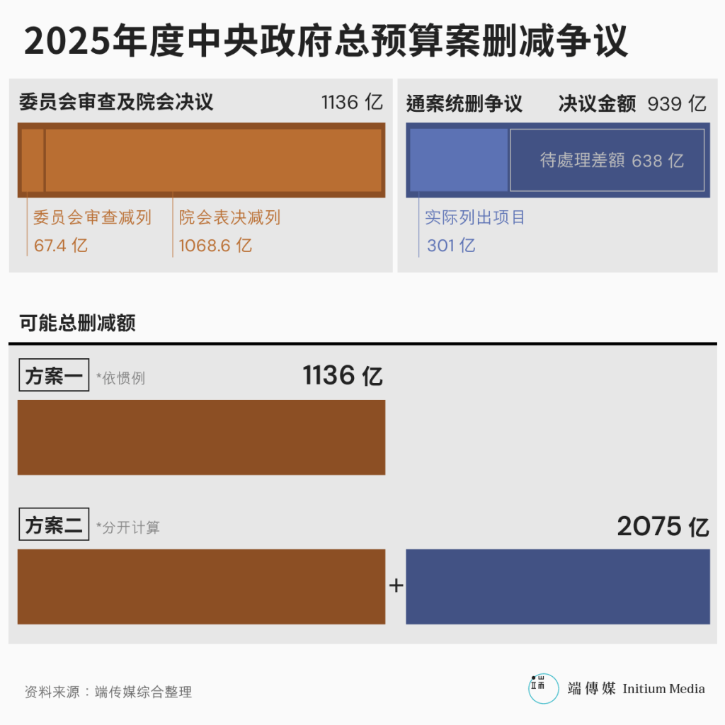 在这样的计算混乱下,可能呈现两种数字:最低估计删减金额約为1136亿元,包含委员会审查及院会表决减列金额,但未计入通案统删;若将通案统删939亿元额外纳入计算,总删减额则达約2075亿元。