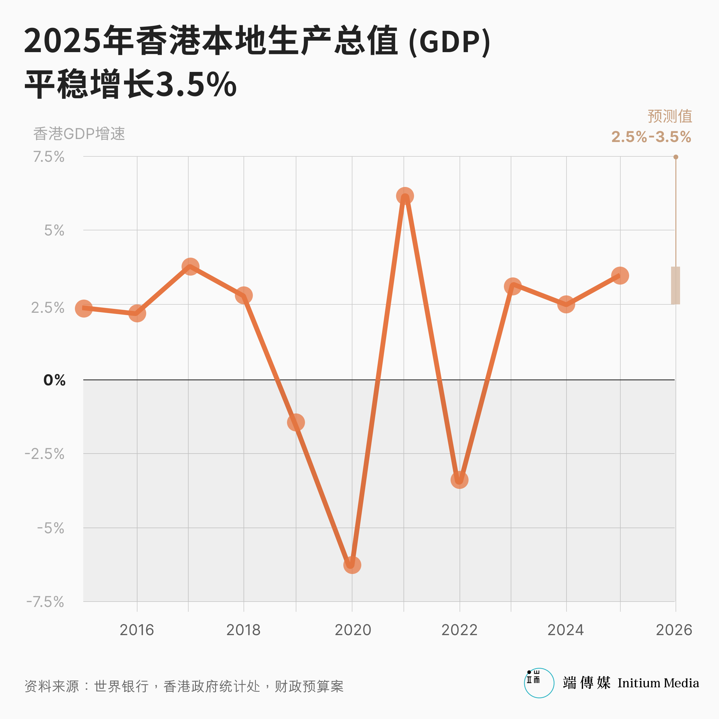 在经济表现方面,预算案形容香港去年经济蓬勃,连续三年增长,全年整体经济增幅3.5%,当中股票市场畅旺,首次公开发售IPO为全球第一,而旅客亦攀升,去年访港旅客近5000万人次。前瞻2026年经济,预算案料全球贸易紧张局势缓和,中国实施积极有为的宏观政策,香港在2026年可增长2.5%至3.5%。