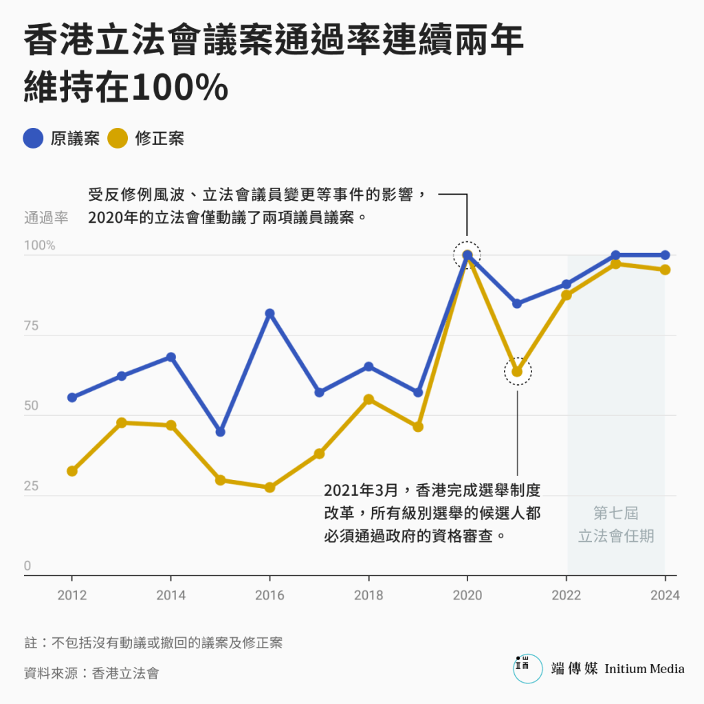 百分之百的議案通過率,內地事務和用語增多,討論人權、司法和政府行政的議題大幅度減少——端傳媒分析2012至2024年共380篇無立法效力的議員議案後,看到了香港立法會議案辯論的新生態。