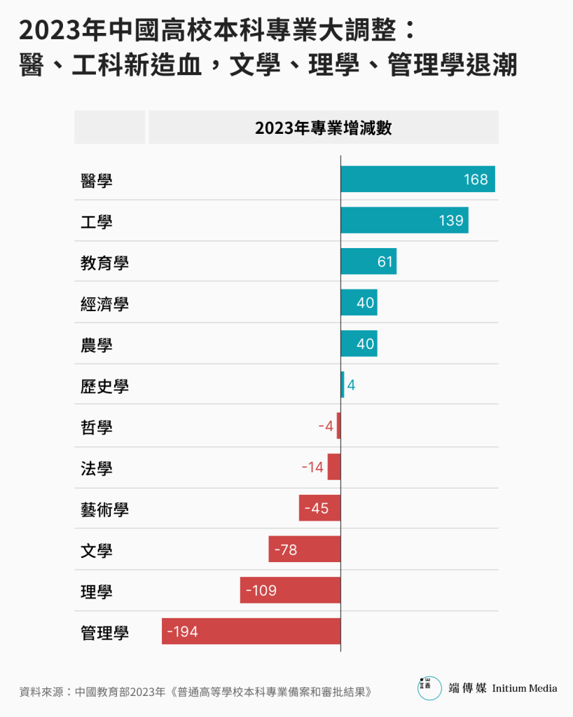 另據中國首家高等教育管理數據與諮詢公司麥可思麥可思《中國-世界高等教育趨勢報告(2025)》的數據,中國近十年新增「智慧」「智能」專業1799個,超八成在近五年內新增;而設計學、工商管理和公共管理是專業裁撤重災區,分別撤銷了305個、266個、247個。