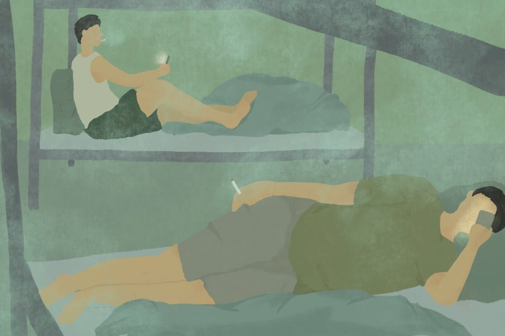 起初,我以爲正好碰上休息日。但接下來幾天,我發現好幾個男性是真的沒有工作,幾乎無時無刻都躺在床上,醒着的時候,他們靠着枕頭,一手拿着香菸,一手捧着手機看視頻或打遊戲。除了自己的床位,他們也沒有地方可以去。