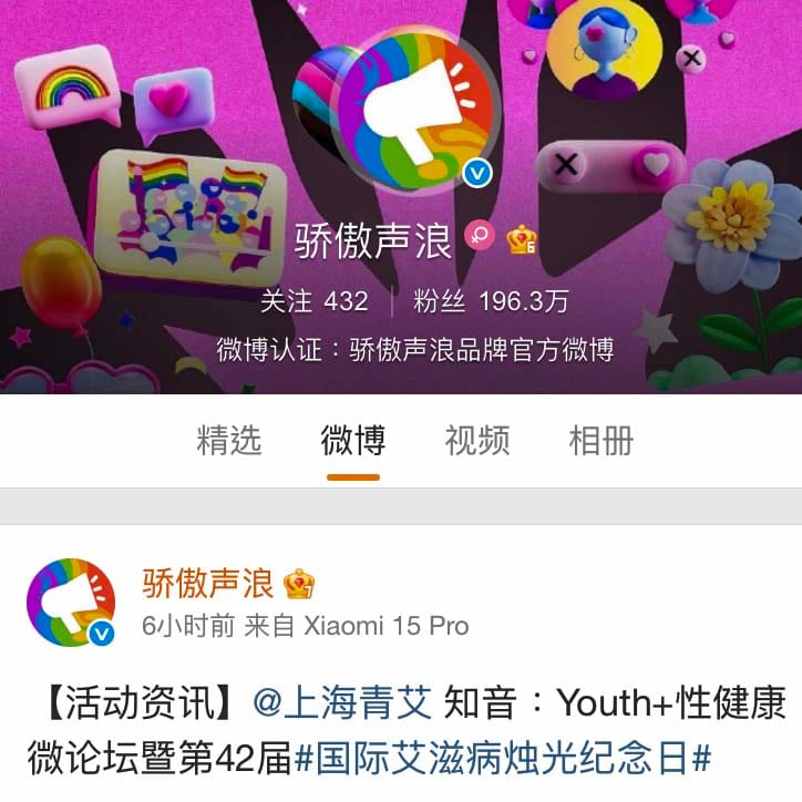 “同志之声”成立于2009年,系微博上线以来第一批面向性少数群体的公益资讯平台。其内容以整理世界各地LGBTQ+社群新闻与支持资源等为主,亦会转发反歧视等话题倡议,刊载用户投稿。