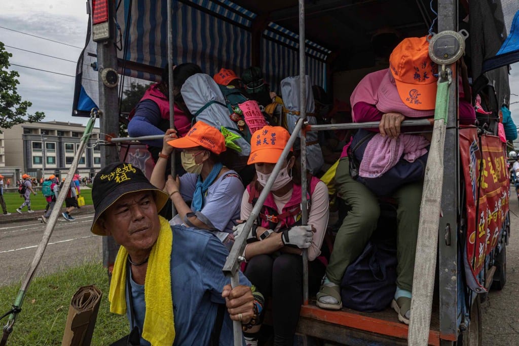 2025年5月9日,台中,香灯脚坐在小货车上,一边前进一边休息。摄:陈焯煇/端传媒