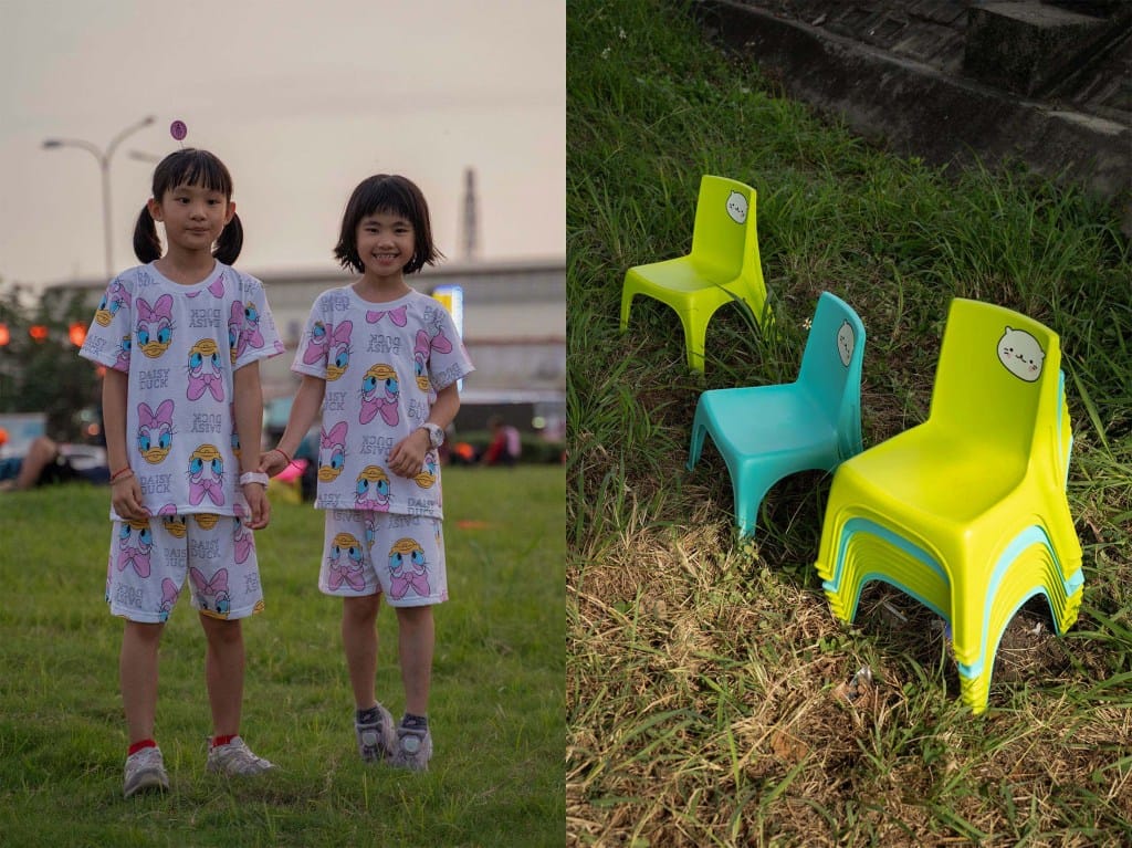 (左)2025年5月8日,彰化,追随白沙屯妈祖的小孩。(右)2025年5月8日,彰化,一张张供信众休息的椅子。摄:唐佐欣/端传媒