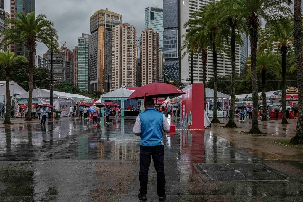 在被铁马包围的维园喷水池旁,24岁的陈先生(化名)一身黑衣,在角落举著伞默站。他向端传媒表示,过去两年也有来维园,前年带著由64位香港记者撰写的《人民不会忘记──八九民运实录》,但被警员发现并没收,又请他离开。上年他带著美国学者傅高义教授撰写的《邓小平时代》,未被截查。
