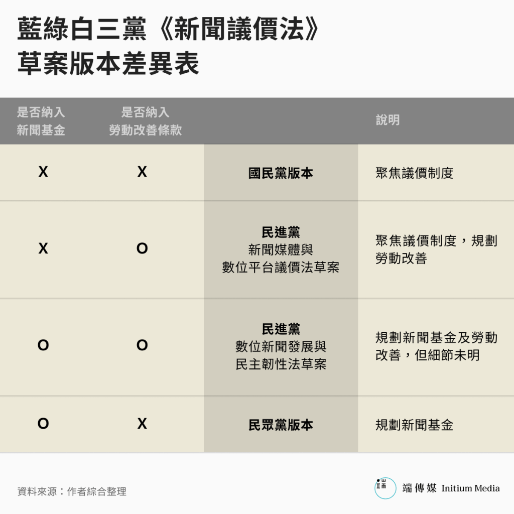 針對新聞基金設立與否,三黨提案出現較大分歧。國民黨版本與民進黨「新聞媒體與數位平台議價法草案」版本僅規範議價制度;民進黨「數位新聞發展與民主韌性法草案」版本與民眾黨版本則同步納入新聞基金設立原則,主張由大型平台提撥部分營收做為新聞發展的基金,並交由獨立委員會管理。