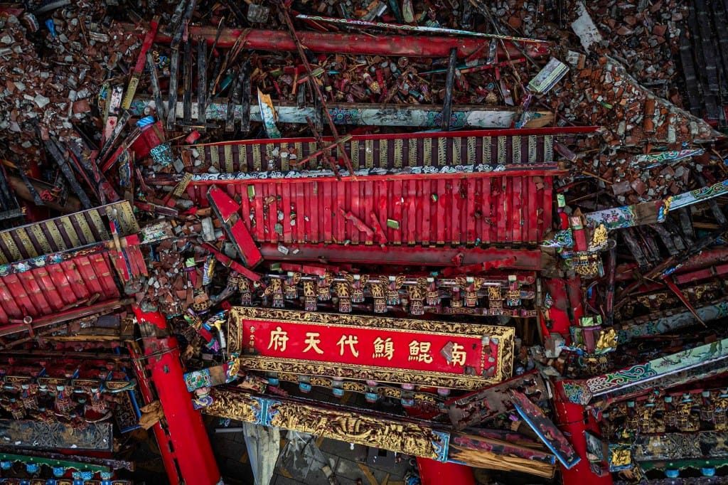 2025年7月7日,台南南鯤鯓代天府,颱風下,以十二根千年檜木興建的牌樓倒塌,滿地殘骸。攝:陳焯煇/端傳媒
