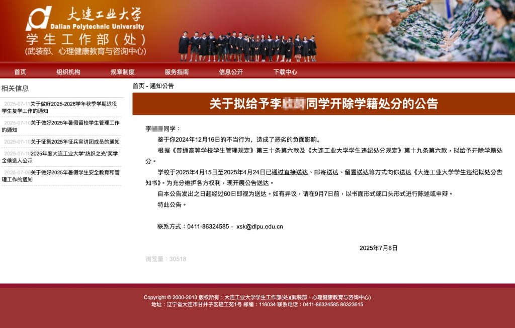 7月8日,大连工业大学学生工作部官网发布《关于拟给予李XX同学开除学籍处分的公告》,在公告标题和正文中公开李某某全名,称其于2024年12月16日的不当行为造成恶劣影响,拟予开除学籍处分。