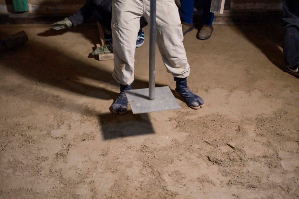 今天是我们的老房子造三和土地板的日子。三和土的日文名为Tataki,跟“敲打”同音,我以为是巧合,但原来做三和土地板的工法,真的是敲打。将沙土、熟石灰、盐卤混成三和土,洒在地上,经过一轮敲打增加密度后,再洒上一层,重复又重复。舖好后得将之搁上多天,待它硬化,结实。说来简单,但地板的厚度少说也有七八公分,手工不纯熟,造工不够仔细的话,地板便会起伏不平,而且一旦硬化了便无法修补。