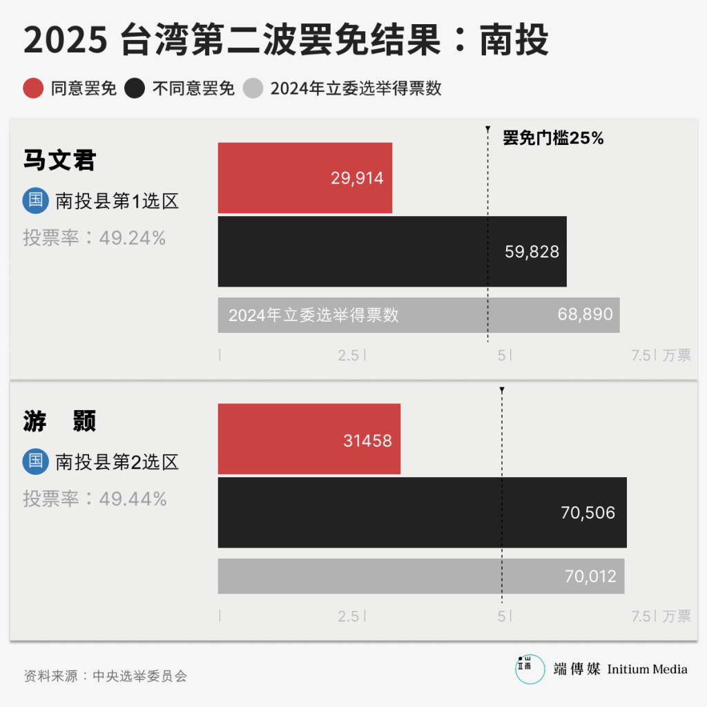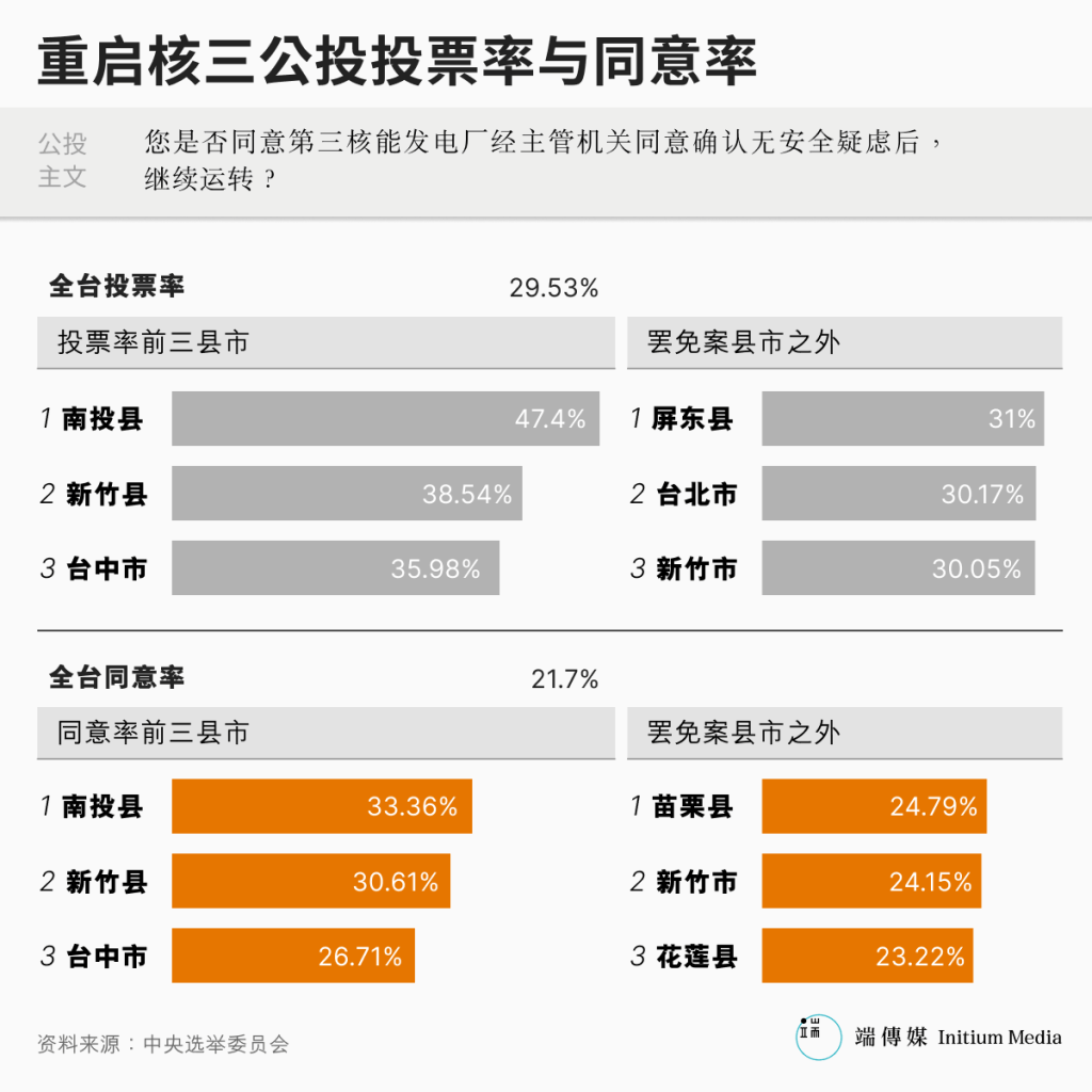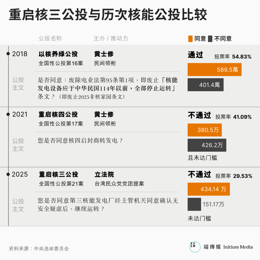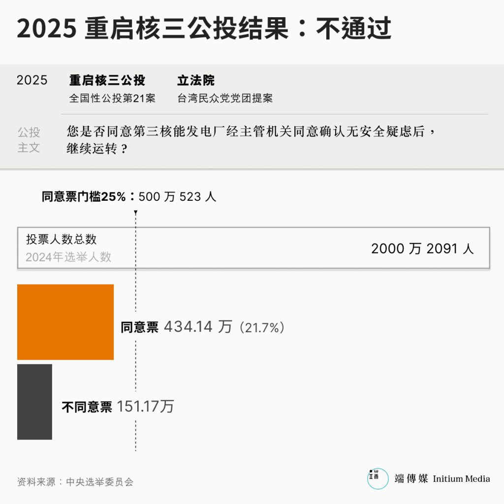 至于民众党发起的“核三重启”公投,虽然同意票大于不同意票,但同意票约430万票,未达25%门槛(500万523张),该案遭否决。