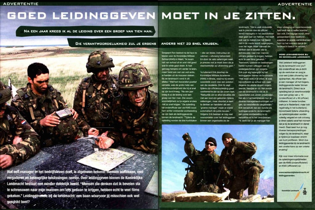 荷蘭遊戲雜誌《Power Unlimited》2008年的1月號在第2、3頁刊出了荷蘭皇家軍隊的全彩跨頁廣告,主打標語為「優秀的領導力與生俱來」。畫面上的士兵對著地圖討論戰術,對頁則附上了大量文字說明。值得注意的是,廣告中幾乎不見武器畫面,因此相較多數戰爭遊戲常見的張揚風格而言更為克制。其核心訊息所指向的是「專業化招募」:想在荷蘭軍中擔任幹部,首先考驗的是管理與領導能力。選擇遊戲雜誌投放廣告是順理成章的,因為其讀者與軍方招募的主要受眾——16至26歲男性——高度重疊。儘管荷蘭社會中的戰爭愛好者正迅速減少,第一人稱射擊遊戲《決勝時刻4:現代戰爭(Call of Duty 4: Modern Warfare)》在2008年假期檔期仍舊登頂銷售榜,累計銷量突破900萬套。