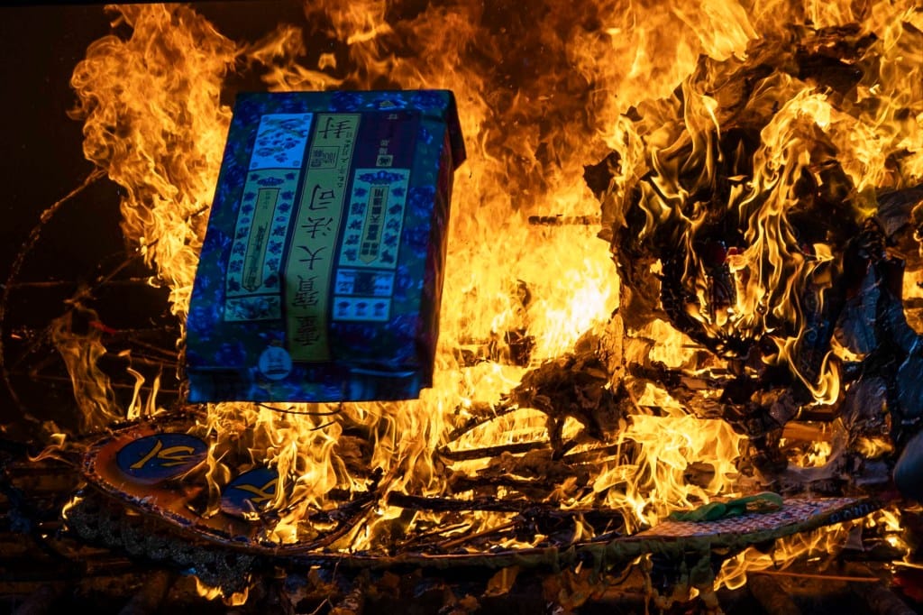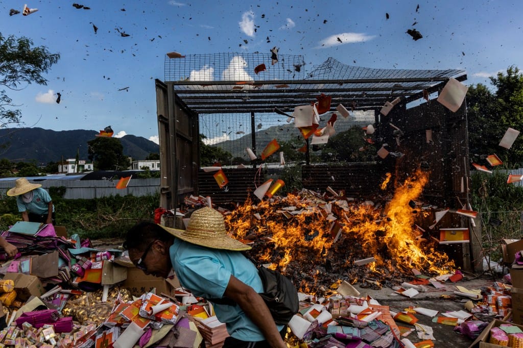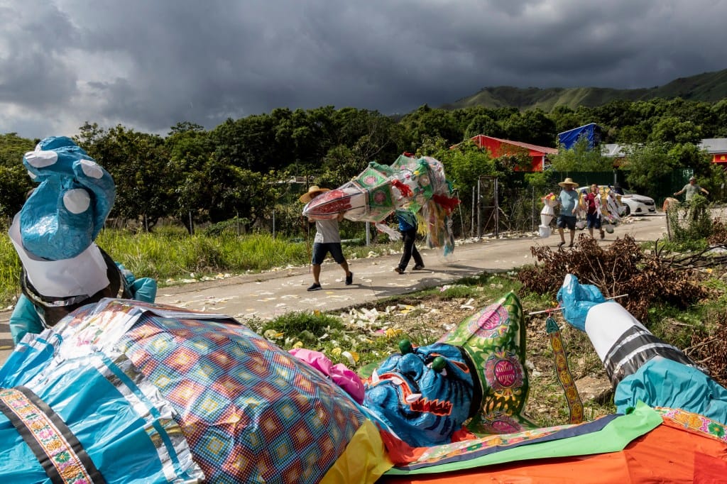 2025年9月3日,元朗大江埔盂蘭勝會,居民將大士王抬往路邊火化,以示神靈已回駕,無需繼續供奉。攝:鄧家烜/端傳媒
