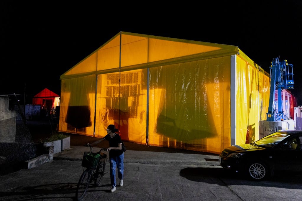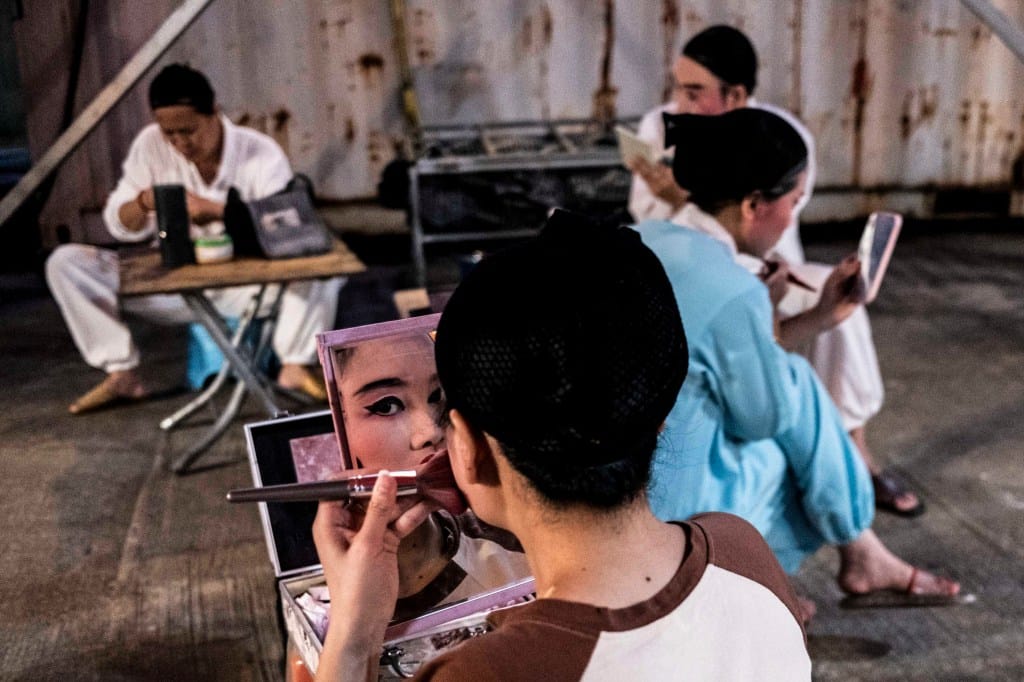 2025年9月2日,元朗大江埔盂蘭勝會,神功戲演員在戲棚前化妝。攝:鄧家烜/端傳媒