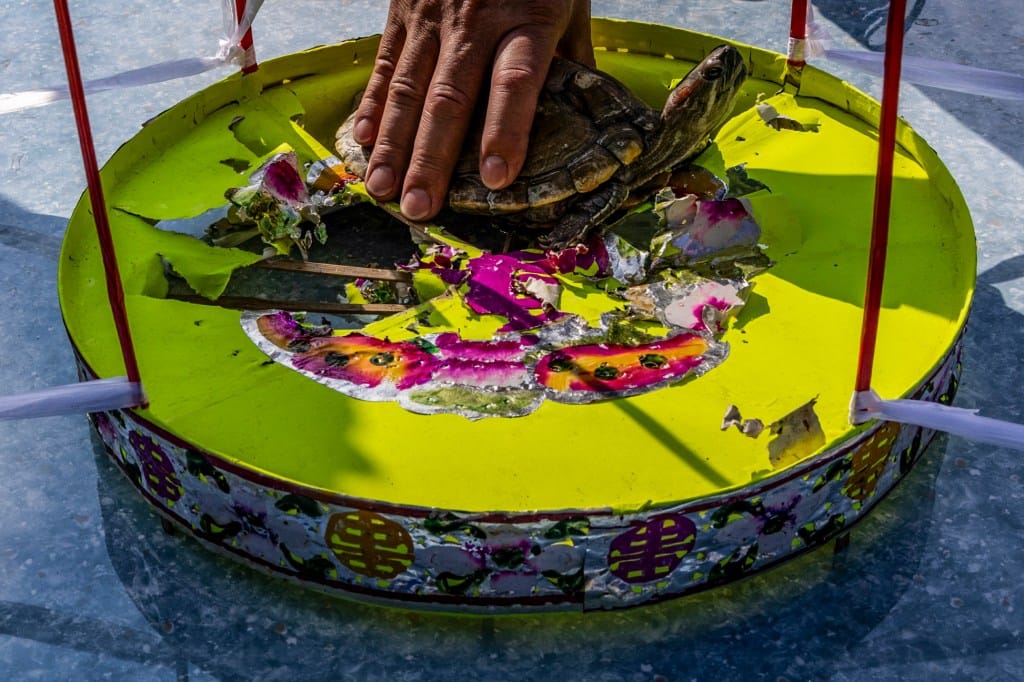 2025年9月6日,坪洲中元建醮盂蘭勝會,居民到沙灘準備將烏龜放回大海。攝:鄧家烜/端傳媒