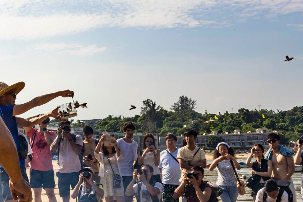 2025年9月6日,坪洲,居民在沙灘放生雀鳥。攝:鄧家烜/端傳媒
