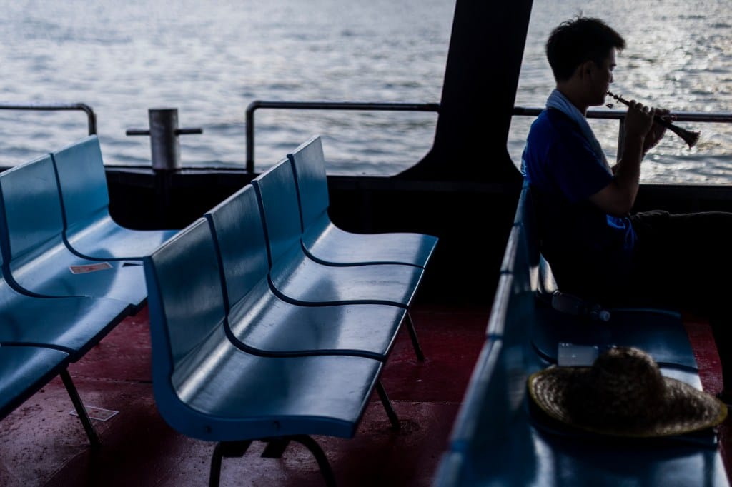 2025年9月6日,坪洲,相傳水鬼無法登岸取食,居民乘船出海吹嗩吶召水鬼。攝:鄧家烜/端傳媒