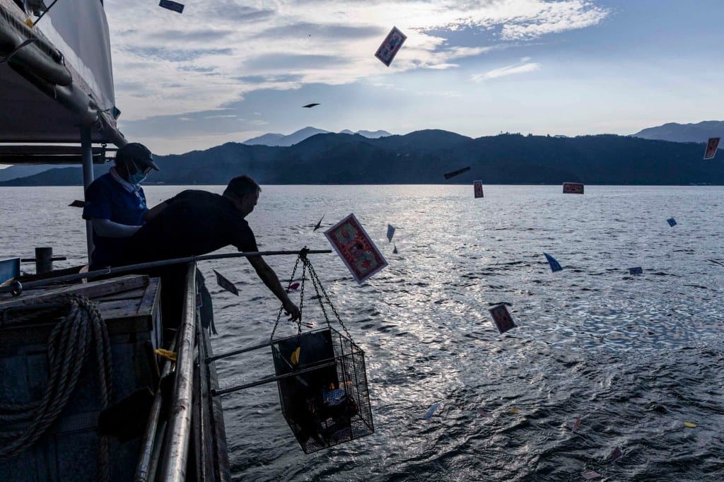 2025年9月6日,坪洲,居民乘船出海燒衣紙祭祀水中亡魂。攝:鄧家烜/端傳媒
