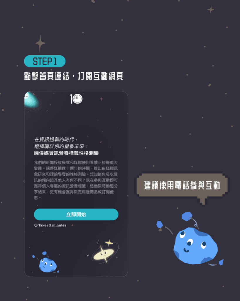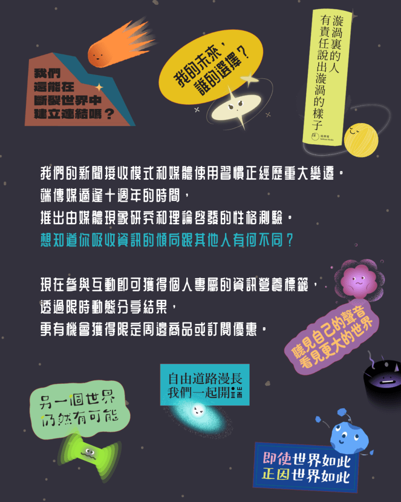 透過情景問答,你將會進入一個被資訊過載和演算法支配下,進入扁平時代的未來。當所有話題變得單一乏味,你跟朋友決意出發,重建久違的多元世界。我們偏好不同議題的形式、接觸內容的方式以及支持媒體的模式,跟大家經常討論的注意力碎片化、過濾氣泡、末日刷屏以至迴音室效應現象之間會否有意想不到的連結?性格測驗嘗試分析你的新聞接收模式,你更可以透過限時動態分享分析結果並跟身邊人比較各自的媒體使用習慣,同時有機會獲得限定周邊商品或訂閱優惠。