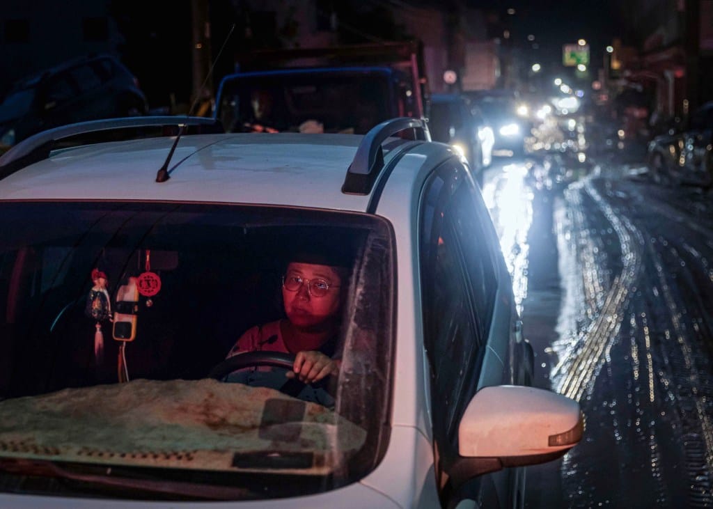 2025年9月26日,花蓮光復鄉,民眾在積滿淤泥的路上駕車,由於部分道路仍未清淤,加上大型車輛進出,市區經常塞車。攝:陳焯煇/端傳媒