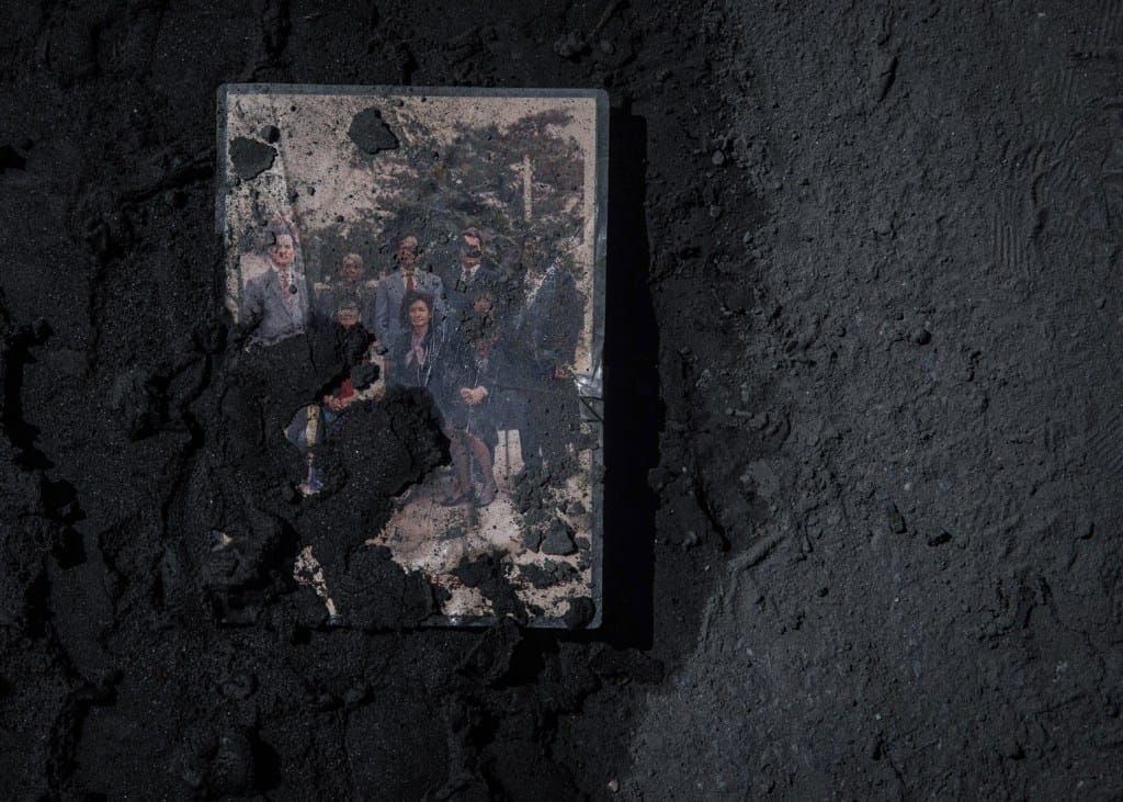 2025年9月30日,花蓮光復鄉,在一間被洪水沖毀的房屋外,一張照片在淤泥上。攝:陳焯煇/端傳媒