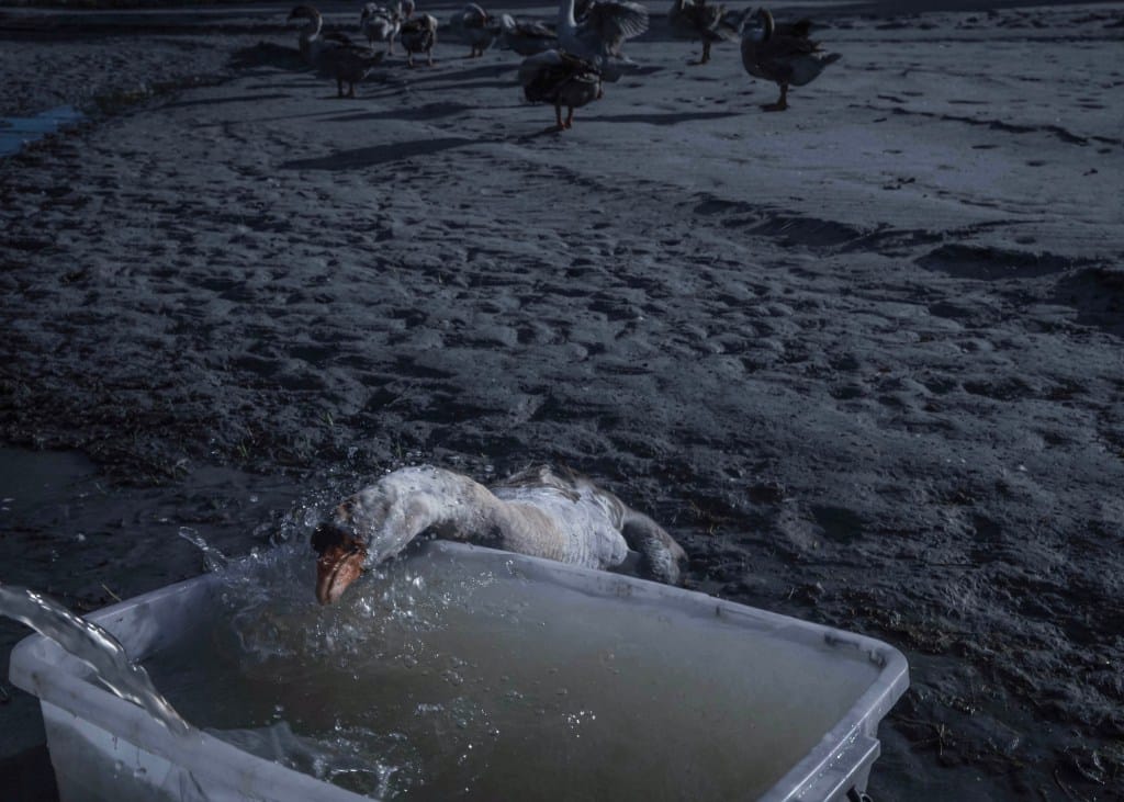 2025年9月30日,花蓮光復鄉,一個農場上,鵝在清洗身體。攝:陳焯煇/端傳媒