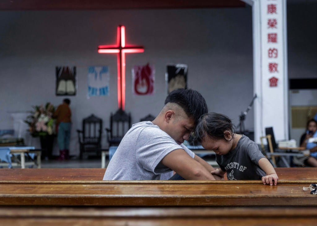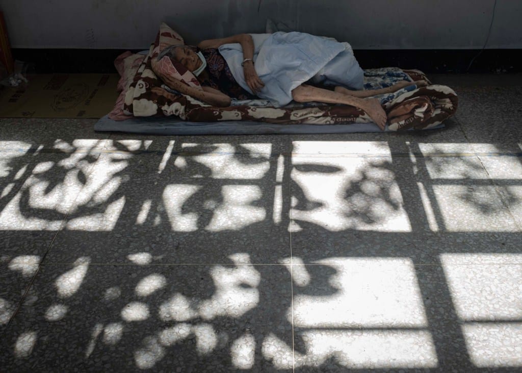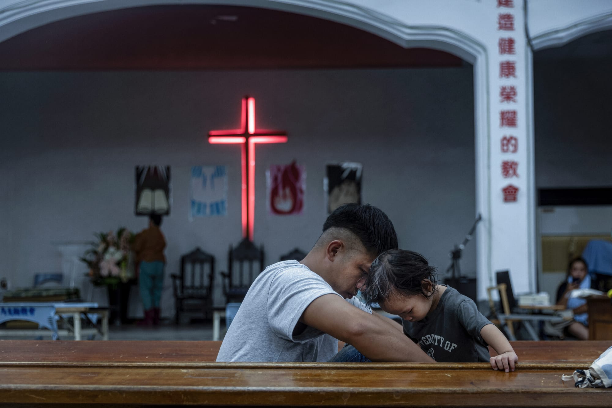 2025年9月25日,花蓮光復鄉,老人被安置在教會內,陽光打在地板上。攝:陳焯煇/端傳媒