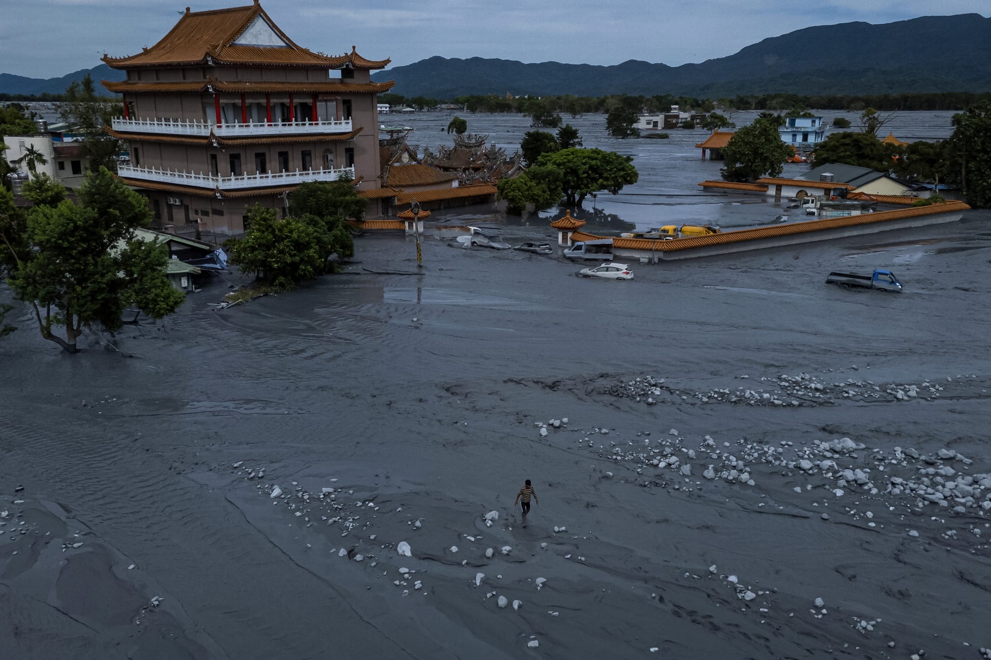 2025年9月25日,花蓮光復鄉,一名民眾走在積滿淤泥的路上,花蓮馬太鞍溪堰塞湖潰壩,洪水和淤泥包圍一間宮廟。攝:陳焯煇/端傳媒災後,來自全台的志工如潮水般湧入,人們攜帶鐵鏟與高筒雨鞋,前仆後繼地來到這座台灣東部的偏遠城鎮。人們稱這群志工為「鏟子超人」,他們湧進滿是淤泥的城鎮,挖鏟厚厚的泥濘,一鏟接著一鏟,數萬人齊心協力復原此地。