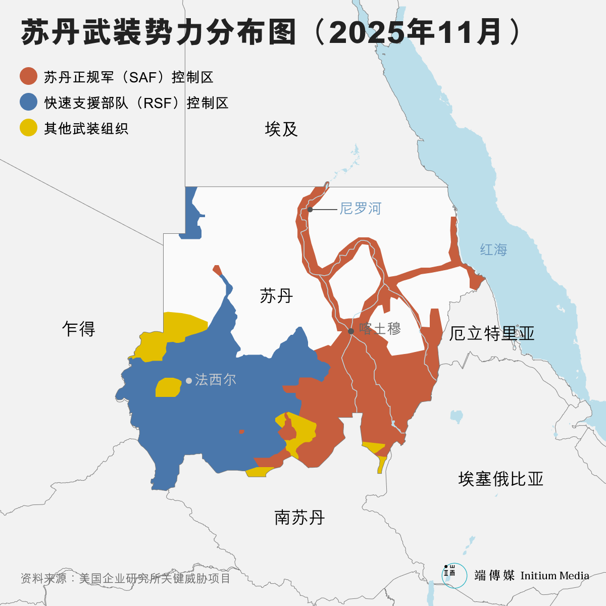 目前,苏丹军方控制首都喀土穆、红海沿岸的战略港口苏丹港及东部若干地区,而RSF叛军则掌控西部与中部大片区域。