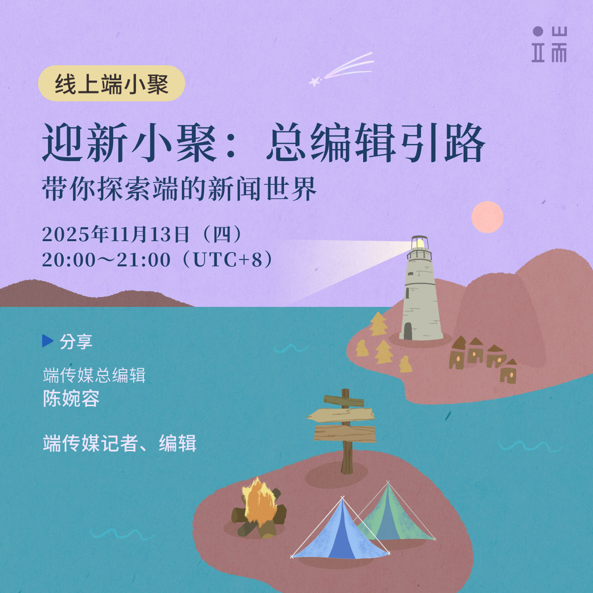 经过第一周的地图探索,邀请你更深入端的新闻世界。我们即将于11月13日举办会员限定的“迎新小聚”,由端传媒总编辑陈婉容作为向导,和端的记者、编辑一起带你从“编辑室的视角”导览端的内容。