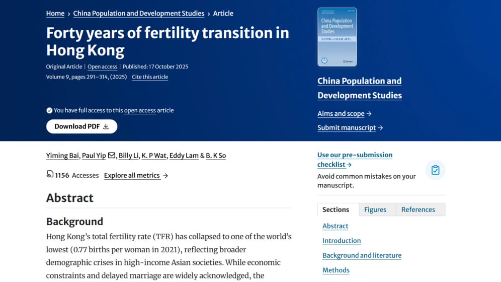 涉及AI虚假论文题为《Forty years of fertility transition in Hong Kong》,作者包括港大社会工作及社会行政学系博士生白逸铭(Yiming Bai)、港大社会科学院副院长、社会工作及社会行政学系讲座教授叶兆辉(Paul Yip)等。网上截图