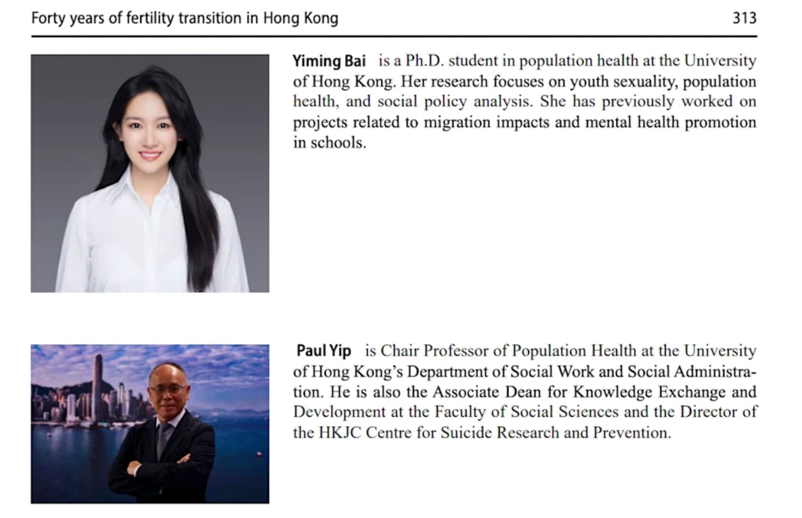涉事的论文共有6位作者,他们在论文的角色、为何未有发现参考文献出错等,是事件的重要关注点。第一作者白逸铭的研究范围为青少年与性、人口健康和社会政策分析,她的指导教授为著名香港学者叶兆辉。其他作者为港大统计与精算学系副系主任屈锦培、同系的荣誉教授林国辉、吉林大学数学系副教授苏鈵钧和医务衞生局高级统计师李若谷。