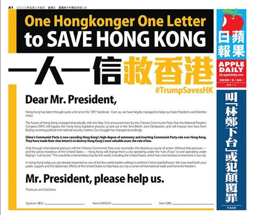 - 黎智英在2020年7月15日通过助手Mark Simon发给蓬佩奥助手Mary Kissel的讯息,要求撤销香港的特殊地位;
