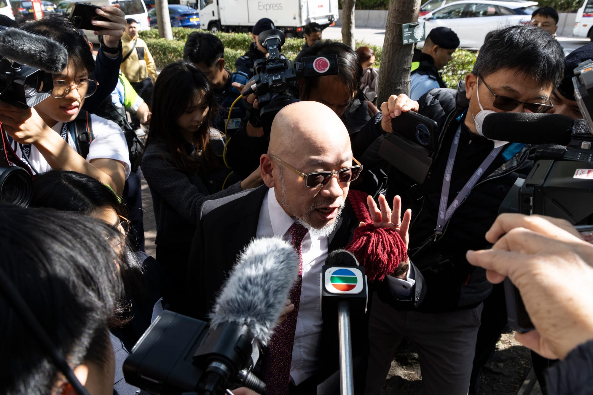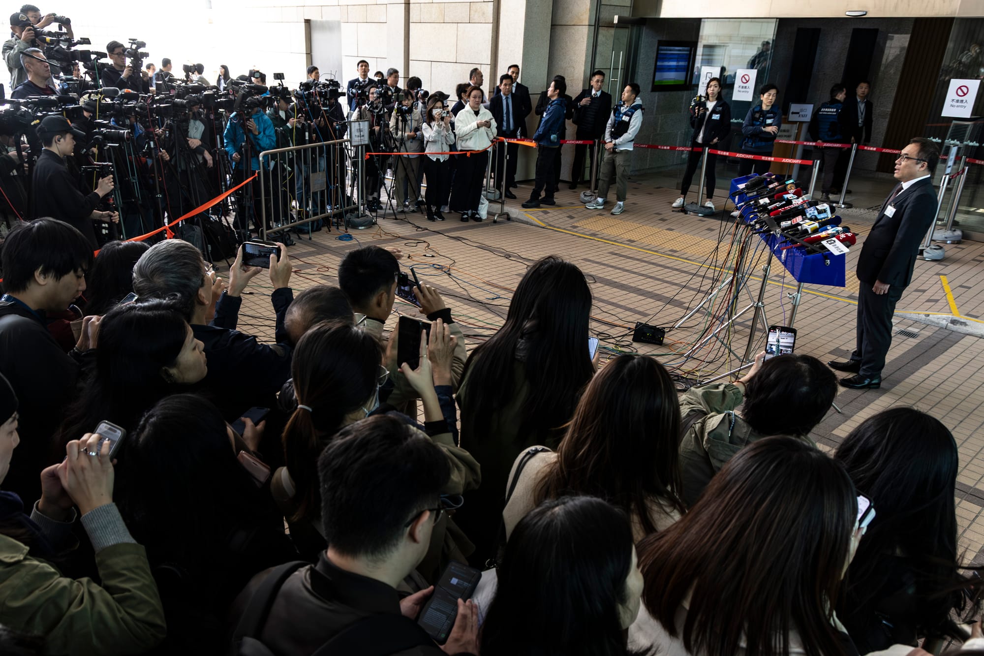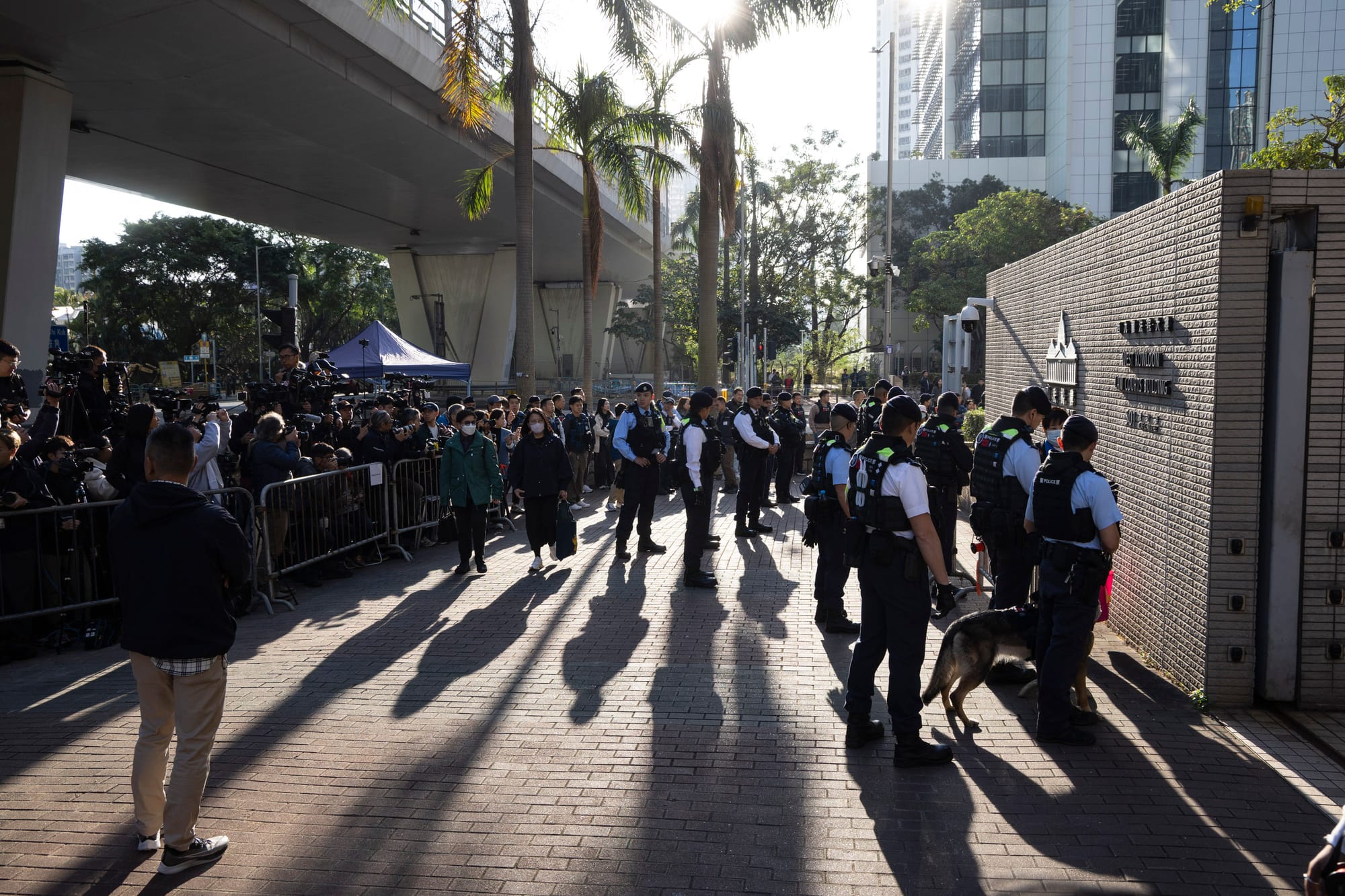 近早上6时,庭外的警力增强,附近不同路口位亦架起阻车器。8时16分左右,旁听人士在警方和警犬注视下逐个入法庭范围内排队;社运人士雷玉莲、各国驻港领事馆代表等亦到场排队。过百中外媒体亦在场准备。