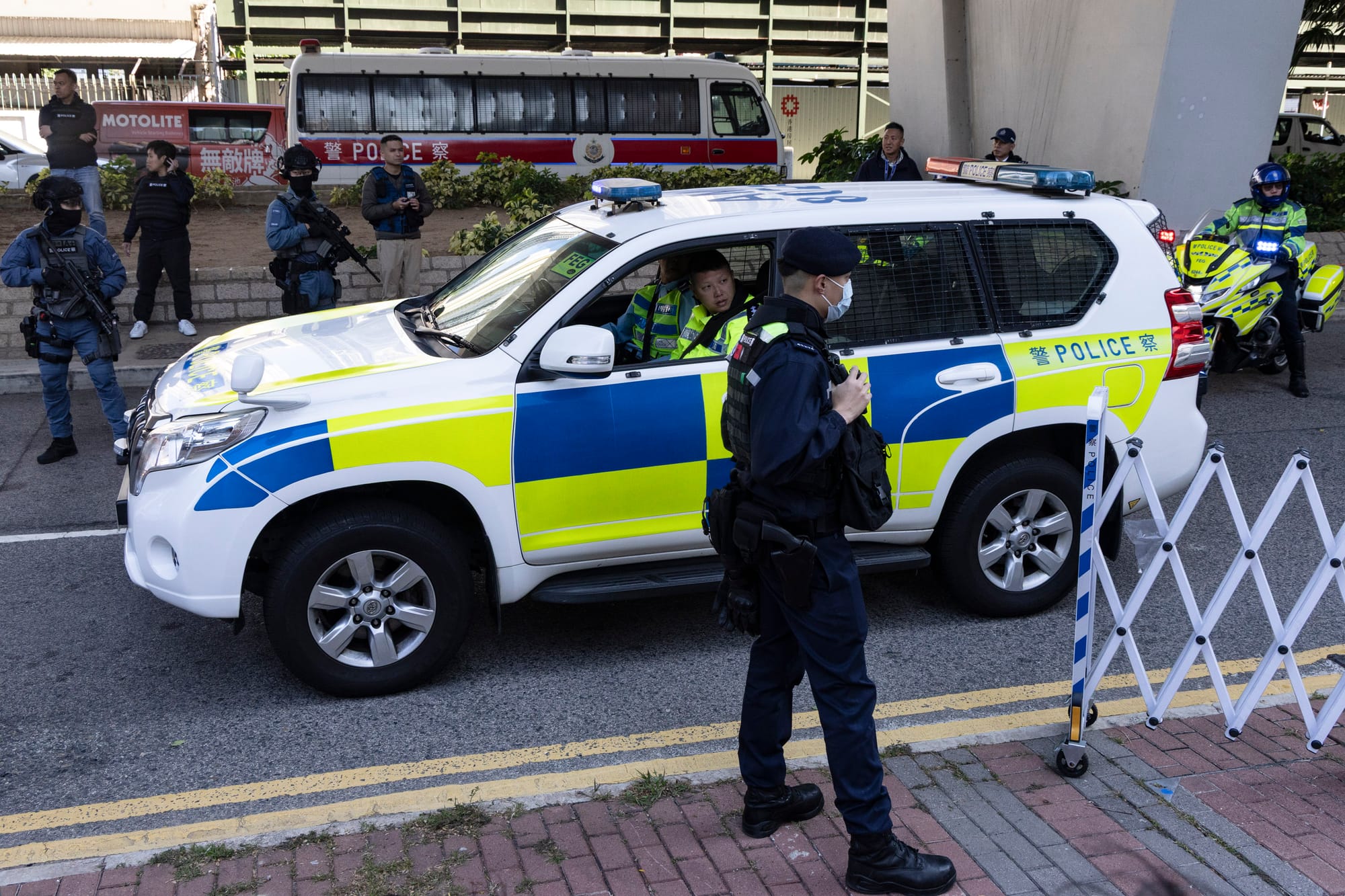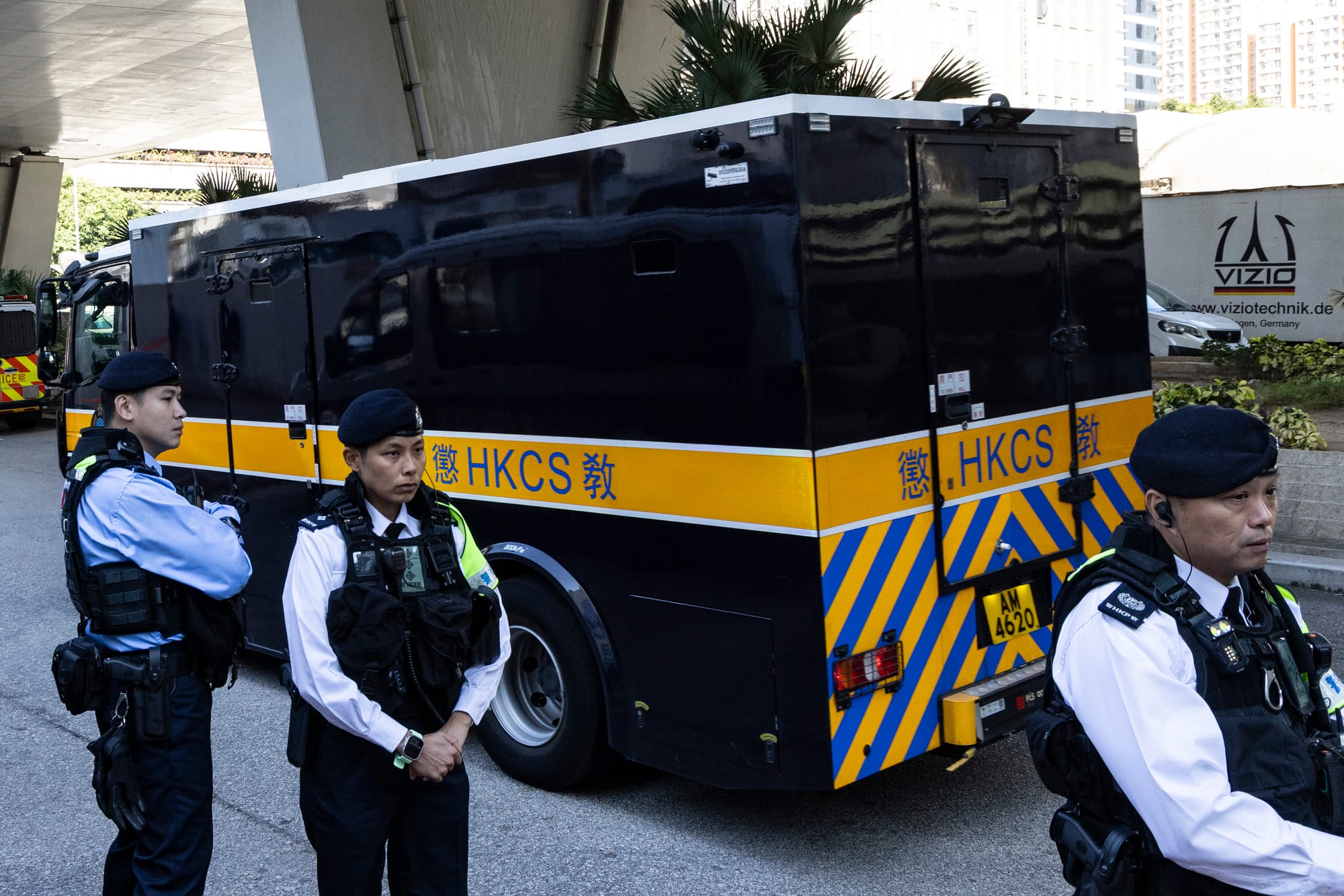 宣判后,法院门外有持枪警员戒备,相信载有黎智英的囚车离开法庭。