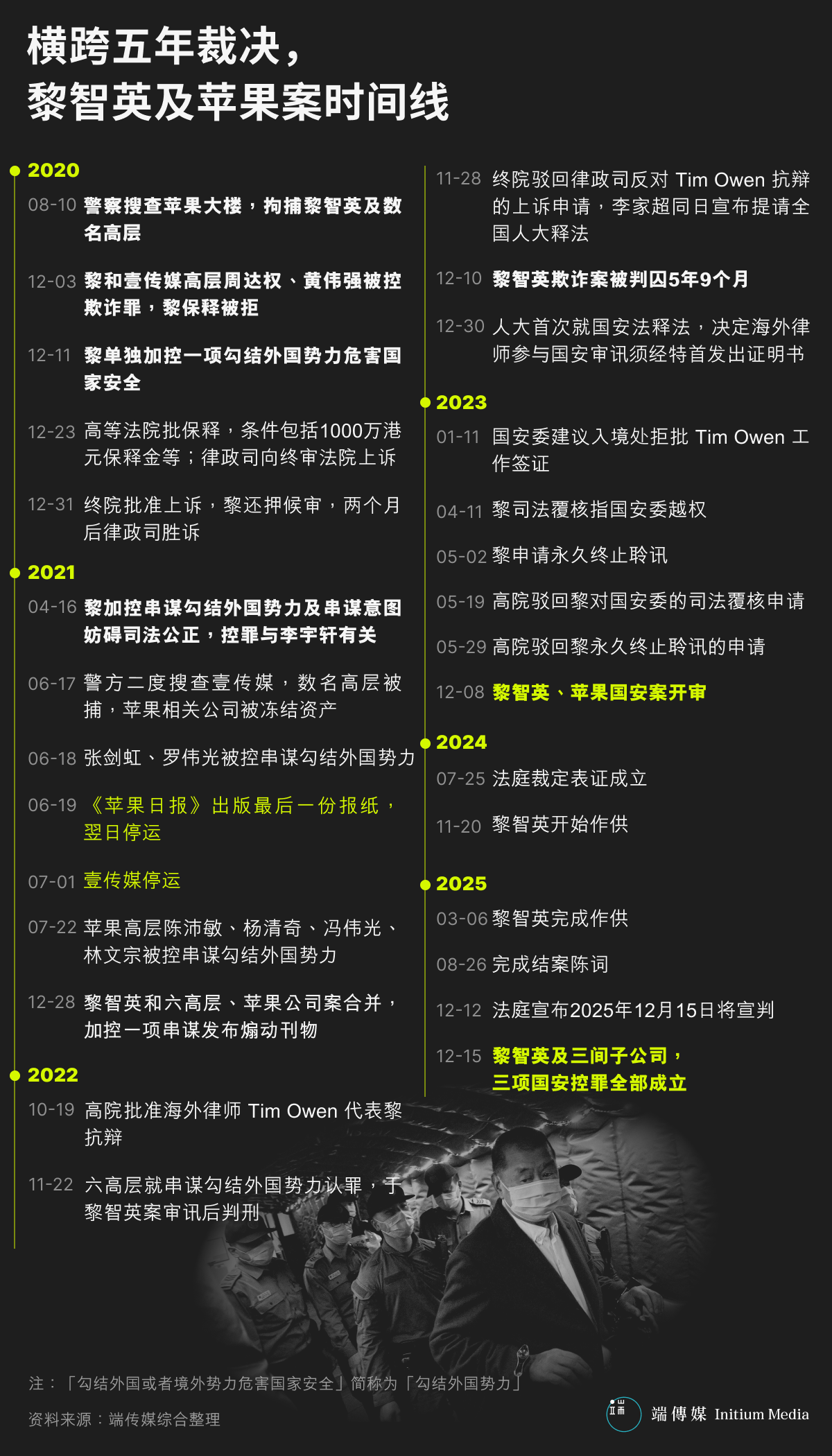香港壹传媒暨《苹果日报》创办人黎智英被控两项“串谋勾结外国势力罪”、一项“串谋发布煽动刊物罪”等案件,由2023年底开审至今,将在今日(2025年12月15日)宣判裁决。