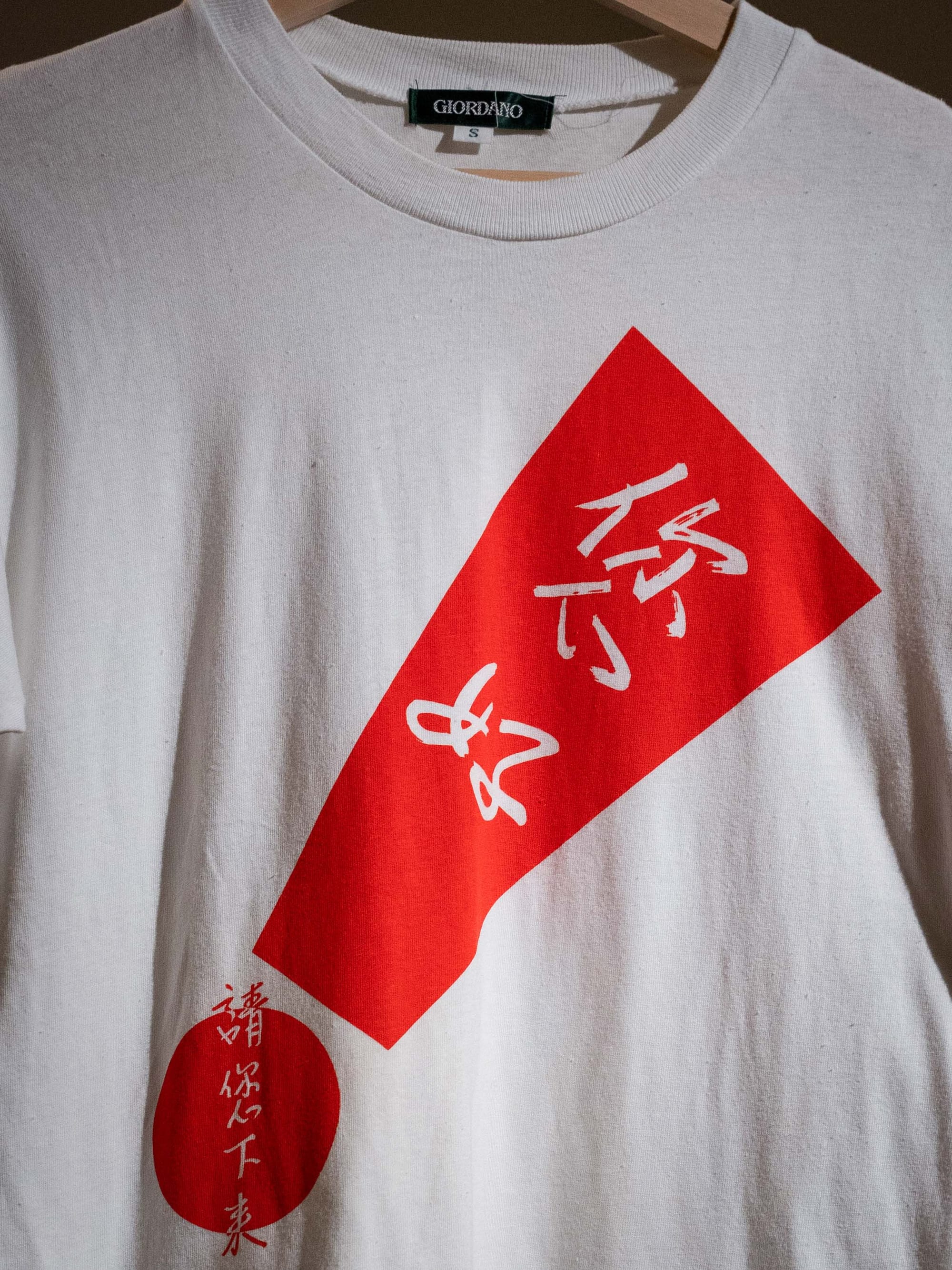 (左)印制于1989年的白色佐丹奴T,衣服正面印著红字:您好,请您下来。(右)2014年和平占中Tee。摄:唐佐欣/端传媒