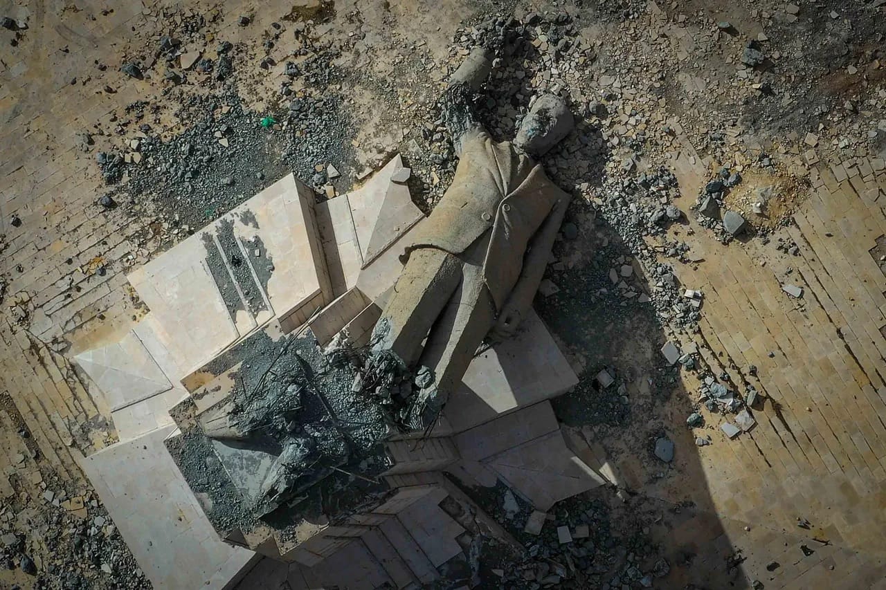 2025年1月5日,敘利亞代爾阿提耶,前總統阿薩德的雕像在上月起義遭推翻及破壞,殘骸遺落在山頂。攝:Ghaith Alsayed/AP/達志影像