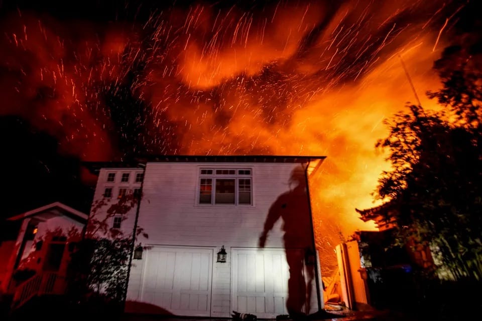 2025年1月8日,美國加州洛杉磯市西面的太平洋帕利薩德(Pacific Palisades)發生嚴重山火,風吹動著餘燼。攝:Ringo Chiu/Reuters/達志影像