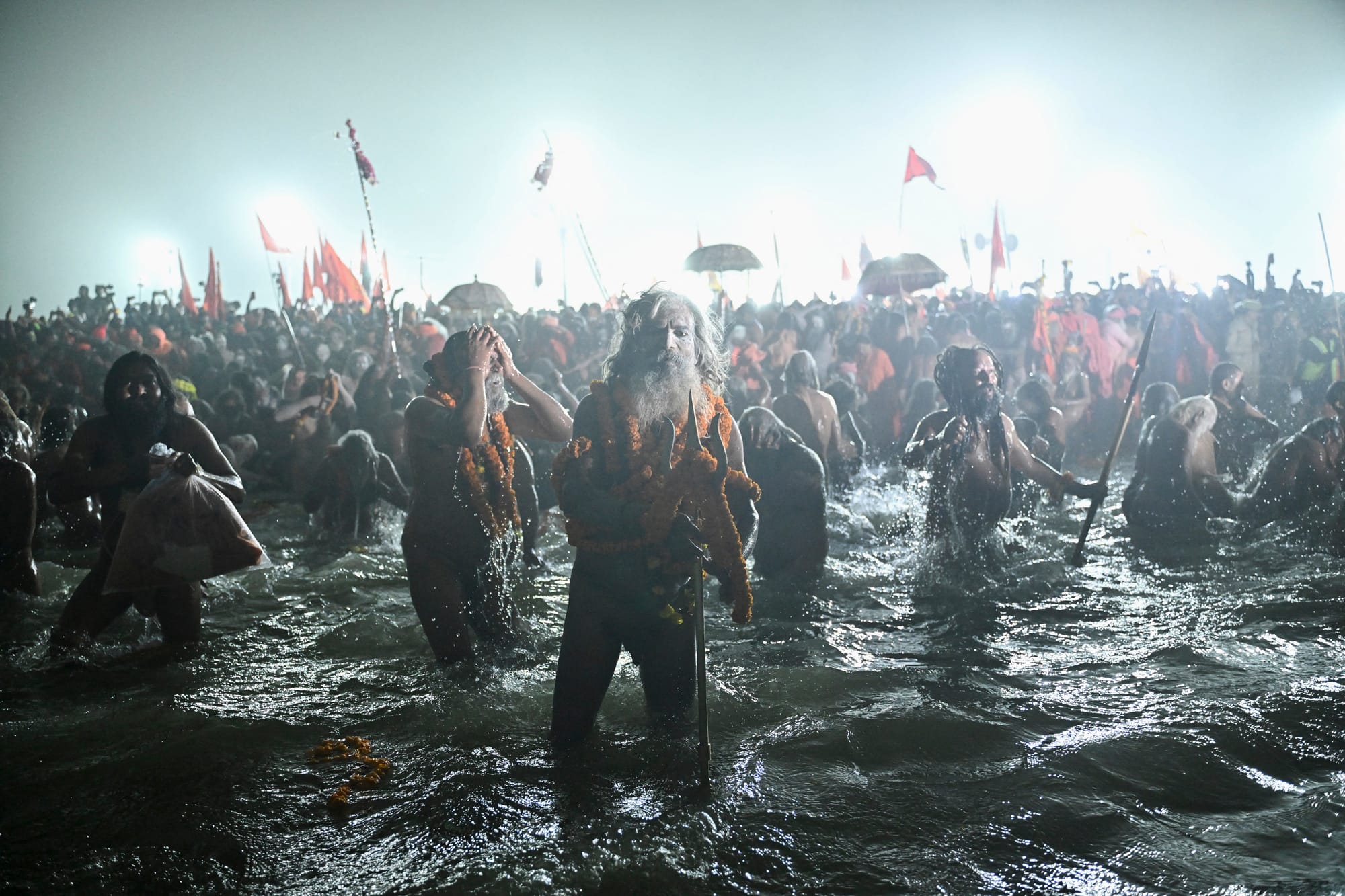 2025年1月14日,印度普拉亞格拉吉,娜迦苦行僧(或稱印度教聖人)在恆河、亞穆納河和傳說中的薩拉斯瓦蒂河交匯處桑格姆(Sangam)沐浴,以慶祝大壺節(Maha Kum Mela)。節慶從昨日開始,主辦單位預計預計有4億人參與,是世界上規模最大的集體活動。攝:Idrees Mohammed/AFP via Getty Images