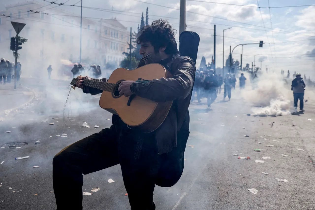 2025年2月28日,希臘雅典,希臘歷來最嚴重火車相撞事故兩週年,全國各地有大批民眾上街,其中雅典的示威演變成警民衝突,一名男子在現場彈奏吉他和口琴。攝:Florion Goga/Reuters/達志影像