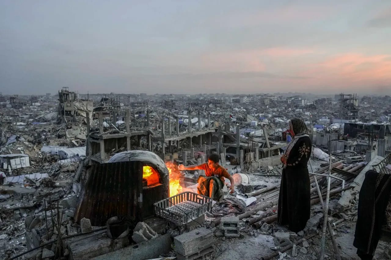 2025年3月17日,加沙地帶賈巴利亞,巴勒斯坦人阿里·馬魯夫和他的母親艾莎在以色列軍隊的空地和地面進攻摧毀的房屋的屋頂上用火做飯。攝:Jehad Alshrafi/AP/達志影像