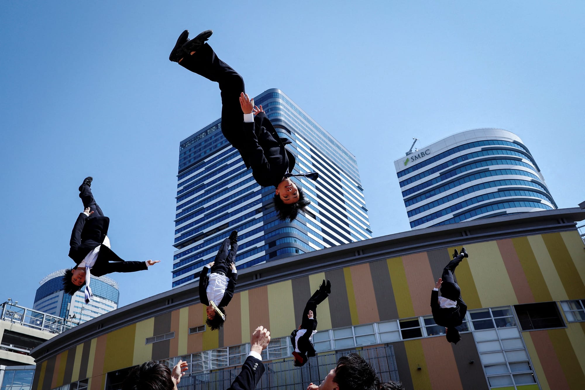 2025年3月22日,日本東京,全由現役商界男士組成的啦啦隊「Cheer Re-Man's」成員在「為日本加油」活動中表演。攝:Kim Kyung-Hoon/Reuters/達志影像