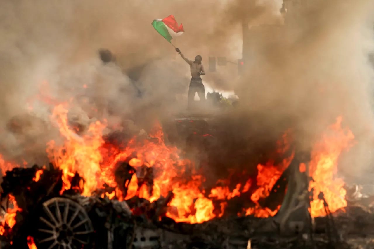 2025年6月8日,美國加州洛杉磯市中心,抗議聯邦移民大掃蕩的人群中,一輛燃燒的汽車冒出濃煙和火焰,男子揮舞著墨西哥國旗。攝:David Swanson/Reuters/達志影像