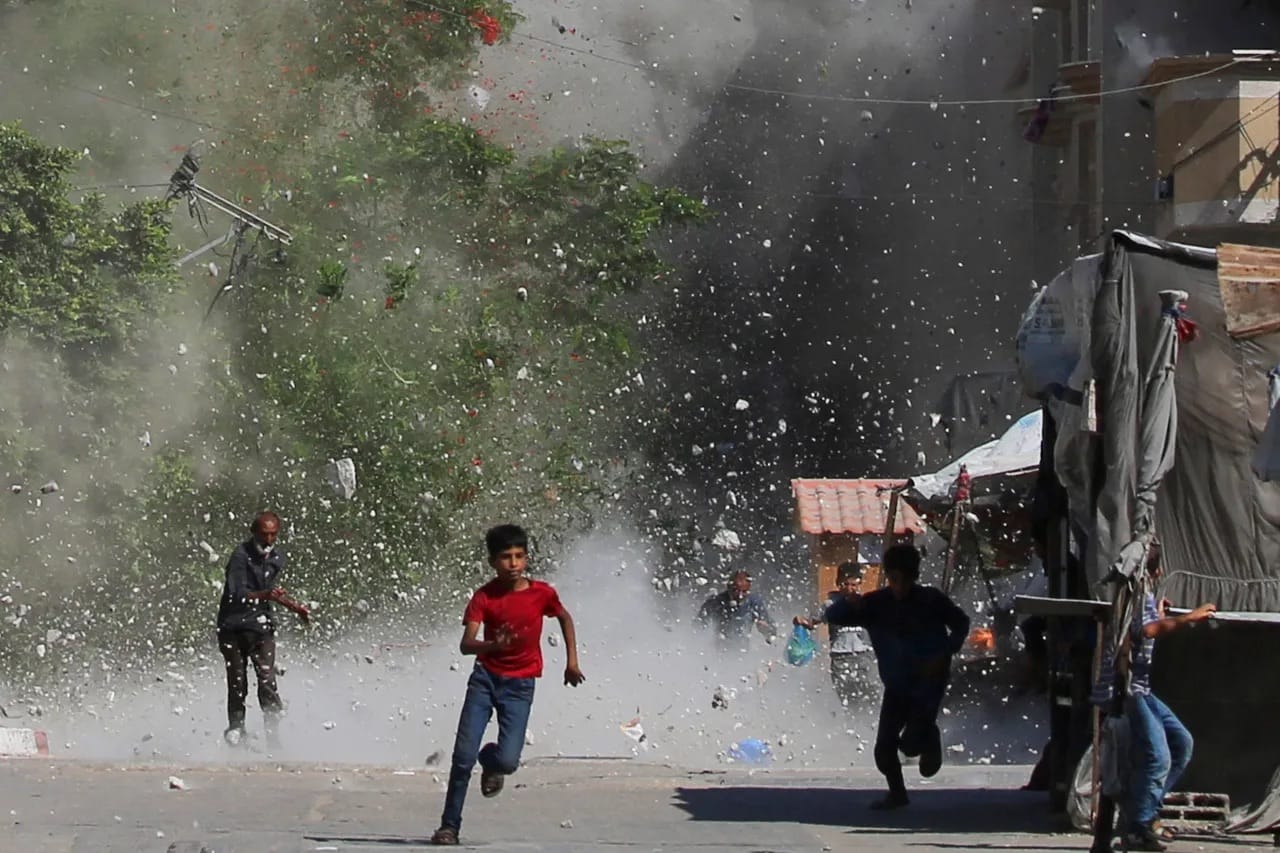 2025年6月15日,以色列襲擊加沙走廊中部的布雷吉巴勒斯坦難民營,爆炸碎片四處飛濺,現場的人四處尋找掩護。加沙民防機構稱,事件造成16人死亡,其中大多數人在等待援助時喪生。攝:Eyad Baba/AFP via Getty Images