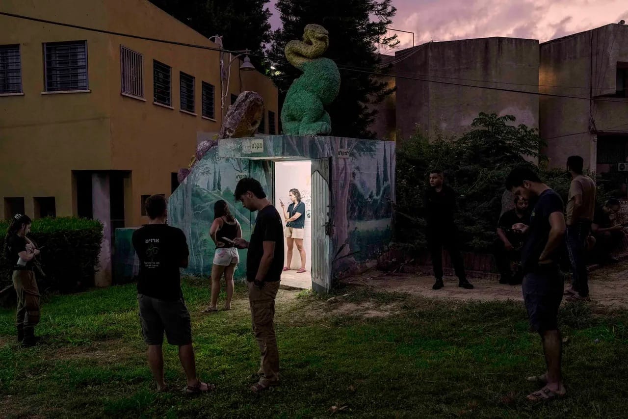 2025年6月24日,以色列士兵和居民在收到伊朗發射飛彈的警報後,聚集在以色列中部霍隆的一個公共防空洞附近。攝:Bernat Armangue/AP/達志影像