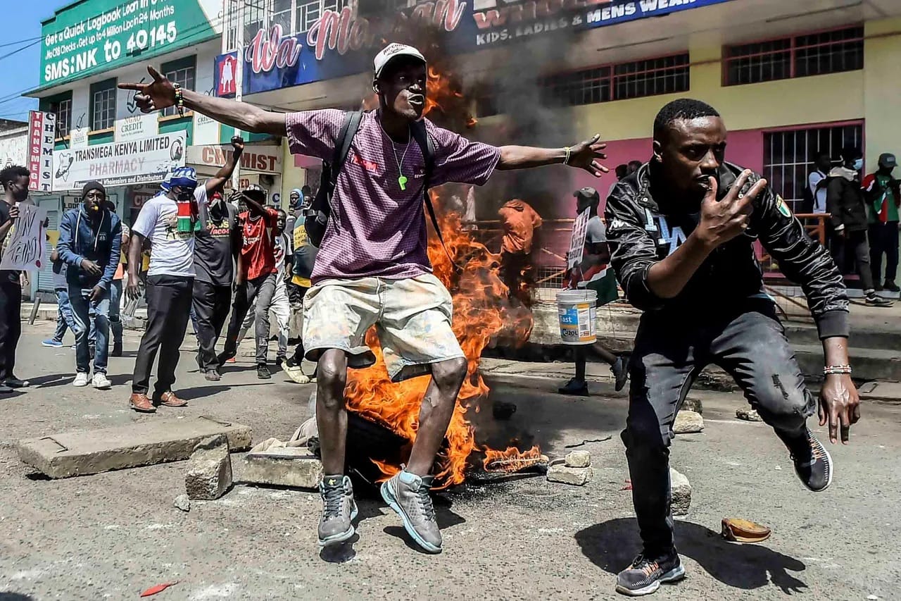 2025年6月25日,肯亞納庫魯,在紀念2024年致命反政府抗議一週年的示威中,示威者在燃燒的輪胎前叫喊。攝:Suleiman Mbatiah/Reuters/達志影像