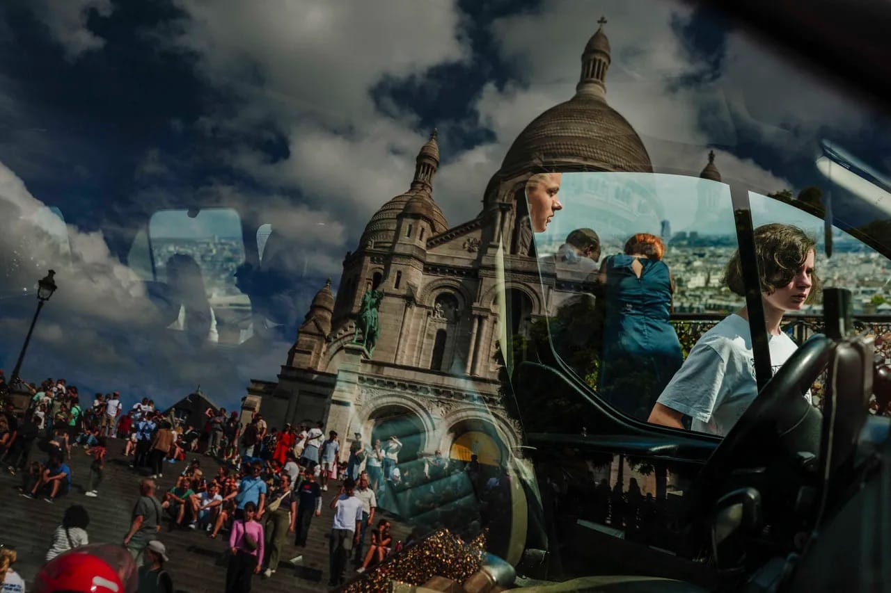 2025年8月1日,遊客漫步在巴黎蒙馬特山上,出租車玻璃上倒映著聖心大教堂的倒影。攝:Dimitar Dilkoff/AFP via Getty Images